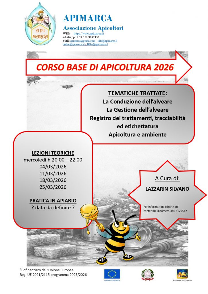 ti informiamo che sono aperte le iscrizioni per il nuovo Corso Base di Apicoltura 2026 organizzato da APIMARCA a Giavera del Montello.